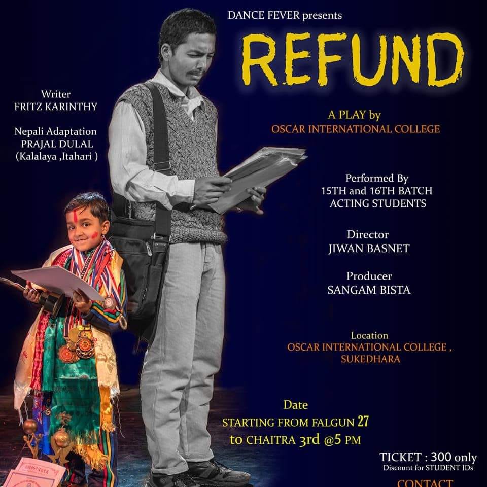 Refund is a stage play directed by Prajal Dulal and performed by Kalalaya Itahari, the city’s only active theatre group. The drama tells the story of Gopal Khatri, a frustrated student who demands a refund of his schooling expenses, blaming poor education for his failures in the job market.